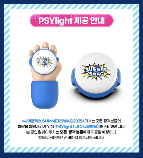 2025싸이 흠뻑쇼는 특별함이 있습니다. 광객분들이 싸이 흠뻑쇼를 마음껏 즐길 수 있도록 특별한 선물을 준비합니다. 파란 우비와 파란 비닐 백팩을 준비하였습니다. 단 사용한 우비는 재활용 분리수거를 위해 공연 종료 후 관객 퇴장 동선에 비친된 우비 수거함에 넣어주면 됩니다.
