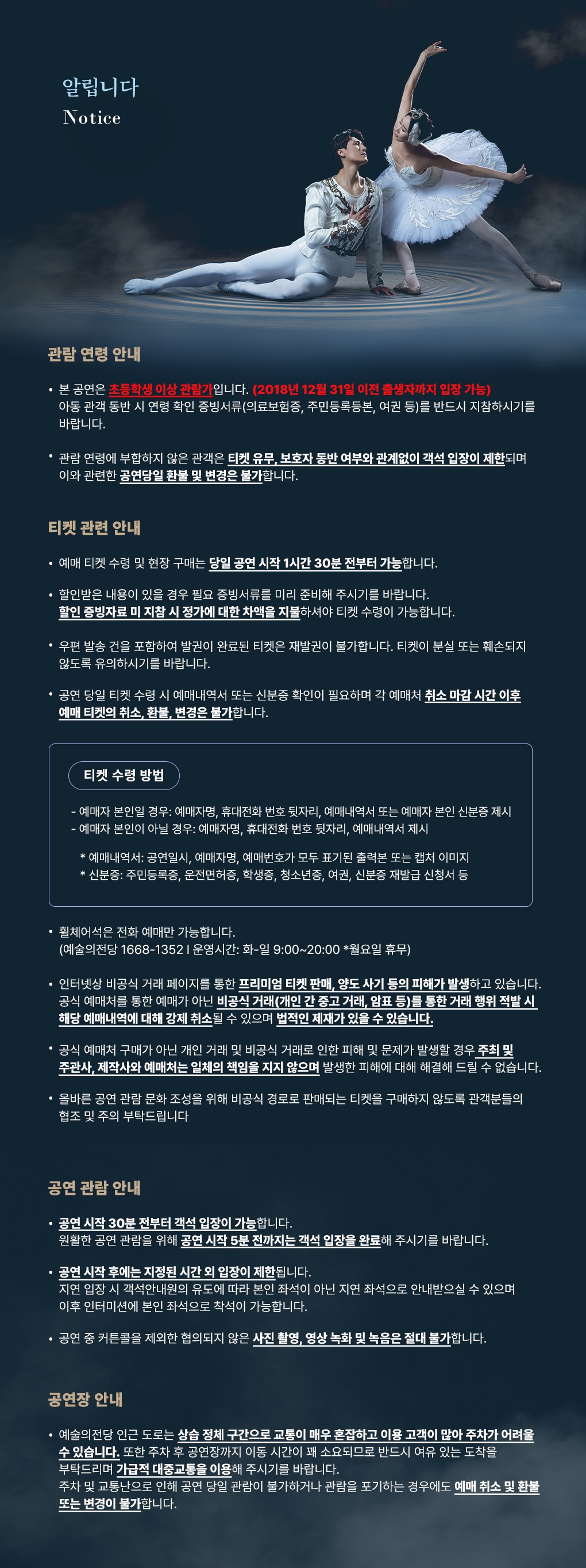 환불 및 교환은 공연 하루 전까지만 가능하며, 관람 연령 제한(초등학생 이상)을 꼭 확인해주세요. 2025 예술의전당 & 유니버설발레단 〈백조의 호수〉의 완벽한 감상을 위해 예매 시 이 부분들을 꼭 유의하시길 바랍니다.